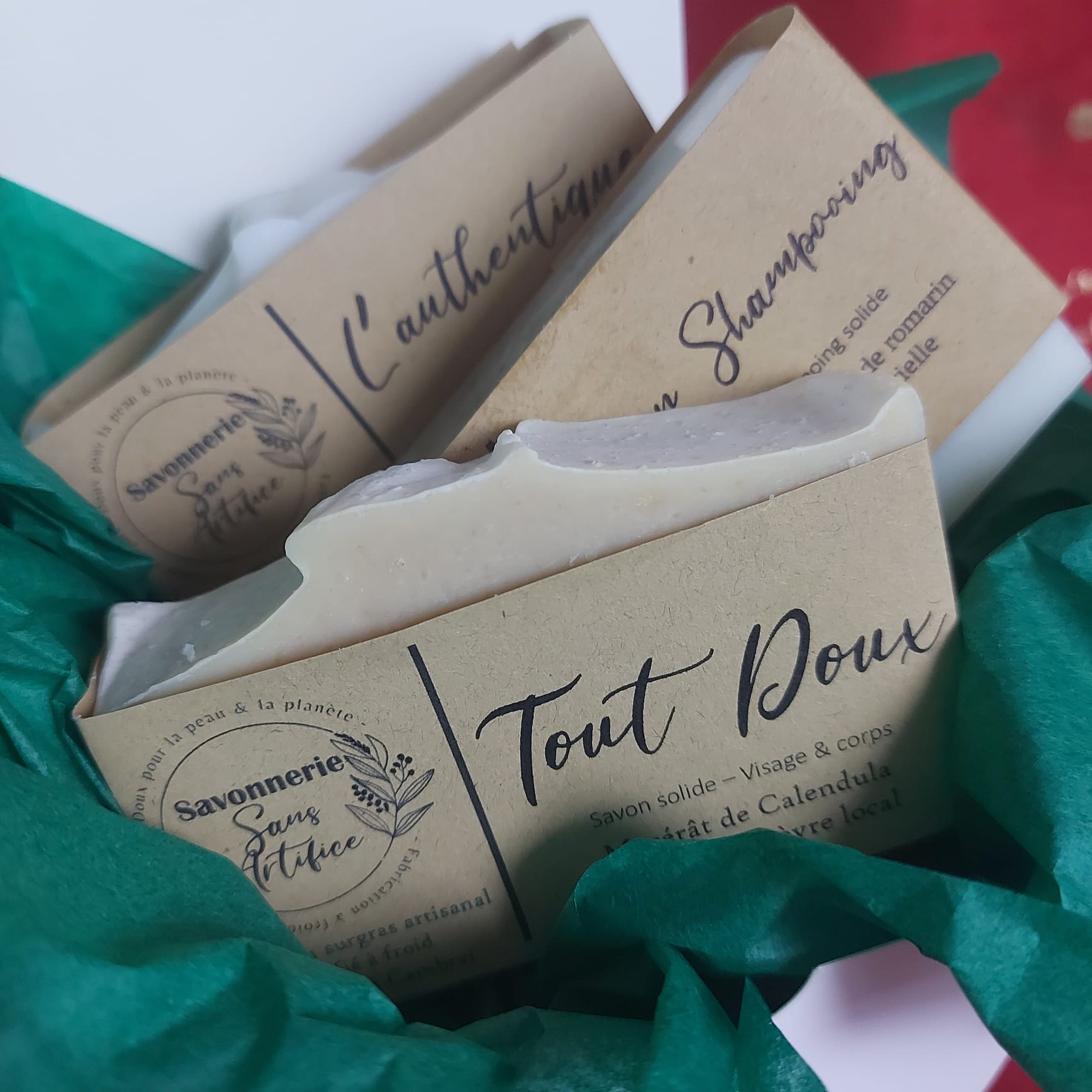 - Le Savon-shampooing est déconseillé chez l’enfant de moins de 3 ans, la femme enceinte et/ou allaitante (présence de romarin dans l’infusion utilisée). Les deux autres savons sont utilisables par toute la famille 🙂